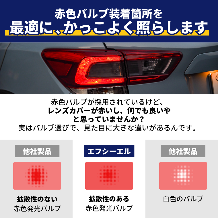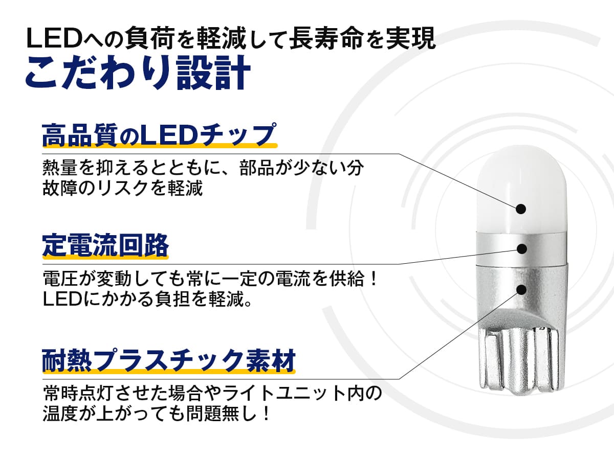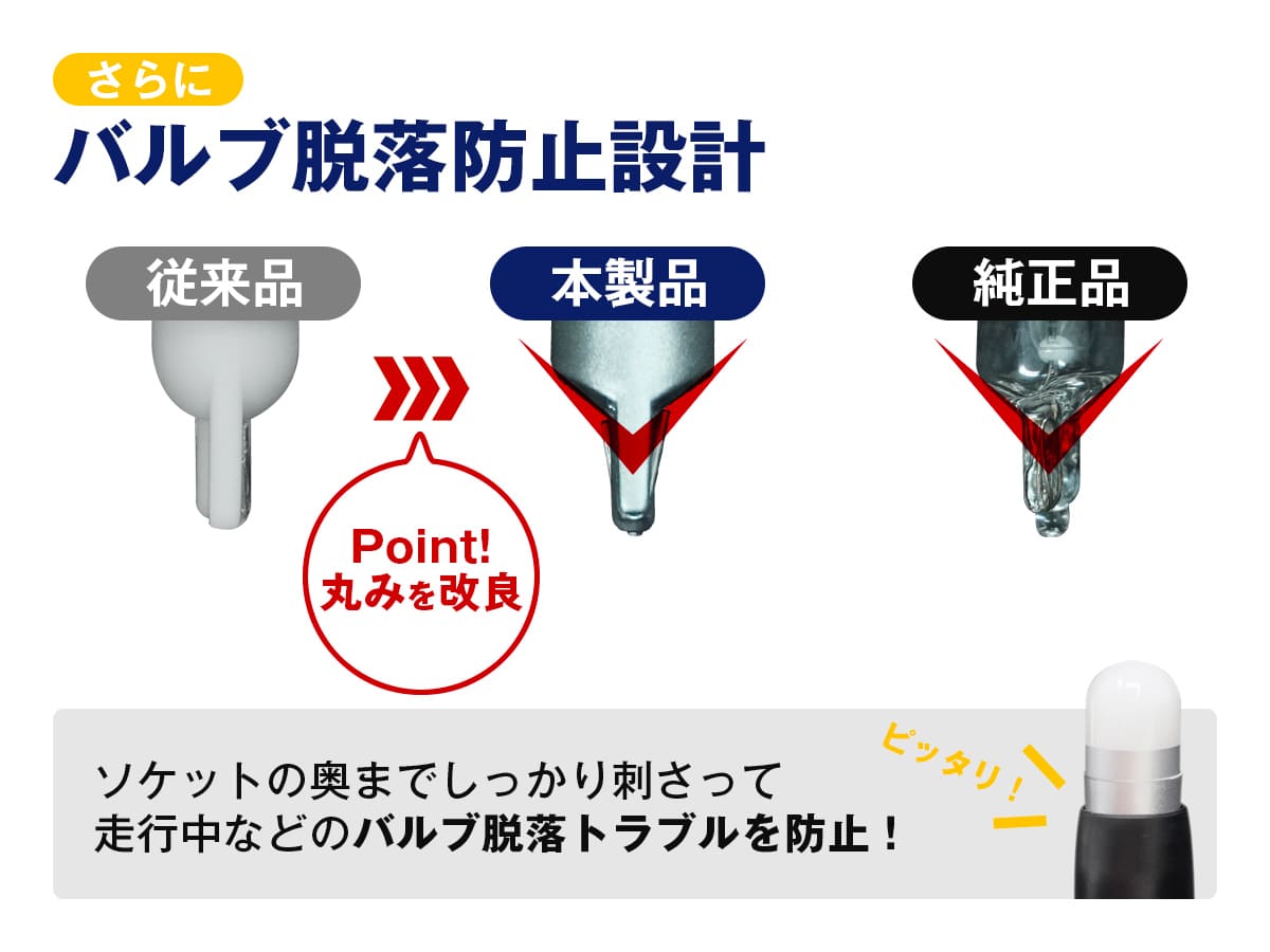 ・24V車への装着はできません。長く使用いただけるように、細部にまでこだわった設計のため、12V/24V兼用品での販売はしていません。 ・輸入車は球切れ警告灯が点灯する場合があるため、お取り付けいただけません。 ・接触不良が原因で点灯しない場合は、下記をお試しください。LEDバルブの電極(針金)を両側とも斜め横に広げる、外側へ広げていただくことで、改善する場合があります。 ・ブルーイッシュホワイトとフロスティブルーは車検非対応です。 ・アンバーはサイドウインカー以外に取り付けた場合は車検非対応です。 ・レッドはテールランプ・ハイマウントストップランプ以外に取り付けた場合は車検非対応です。 その他、保証規定、返品・交換、車検についてはご利用ガイドをご確認ください。 |