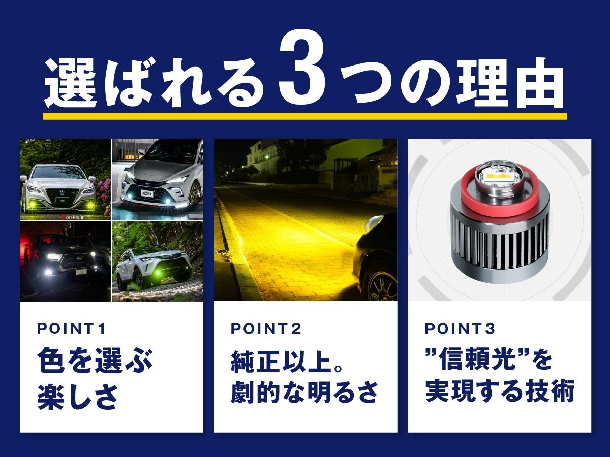 最新、その他車種情報は>適合表<をご確認ください。 ご購入前には、必ず現車にて装着されているバルブ形状と取付けスペースの確認をお願いいたします。 ・バルブ取付時は回しすぎにご注意ください。 ・作業スペースが狭い場合、バンパーを外しての作業となる場合があります。 ・T20トルクスネジが使われている場合があります。その場合は、お客さまにて必要な工具をご準備ください。 ・ヒートセンサーにより、温度上昇時はLEDが暗くなることがあります。 【車検について】 フロスティブルーは車検非対応カラーです。 ライムイエローは車検基準を満たす黄色ですが、検査官の判断により不適合となる場合がございます。 検査時はホワイト or イエローに切り替えてください。 ※メモリー機能付きのため、車検を受ける前にホワイト、またはイエローで点灯するかご確認ください。 【取付不可車両】 24V車/輸入車/純正フォグランプユニット未装着車/純正バイカラーLEDフォグランプ装着車 車種・グレードによっては取付できません。必ず適合表をご確認ください。 特に下記の車種では購入間違いが増えておりますので、ご購入前に今一度ご確認をお願いいたします。 【ノア 90系】S-Z/S-Gグレード:フォグユニット タイプB / Zグレード:L1Bバルブ 【RAV4 50系】アドベンチャーグレード:フォグユニット タイプB / アドベンチャーグレード以外:L1Bバルブ その他、保証規定、返品・交換、車検については>ご利用ガイド<をご確認ください。 |