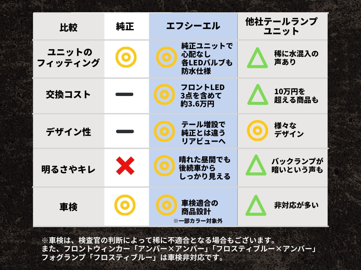 ・本製品は保安基準に準じた設計をしておりますが、まれに検査官によっては保安基準不適合と判断される場合があります。 ・2色切替ウィンカーの「アンバー×アンバー」「フロスティブルー×アンバー」と、フォグランプの「フロスティブルー」は車検非対応です。 ・2色切り替えウィンカーは、純正とは違う光り方をするため事前にお取付け業者に取付/車検可否などご確認ください。 ・挿入口のサイズによっては、固定が緩く水分が侵入してしまう恐れがあります。 その場合は、シーリング材などを使用し、防水処理を行ってください。 ・取り付けに際し自動アシスト、ブレーキサポートなどの安全・快適装備機能の誤作動が出る場合があります。 その他、保証規定、返品・交換、車検についてはご利用ガイドをご確認ください。 |