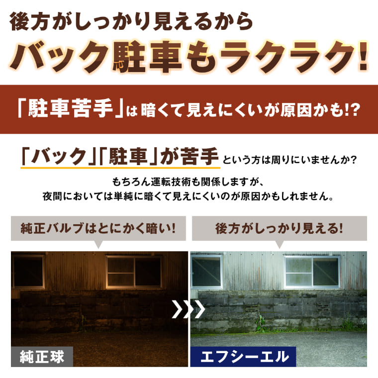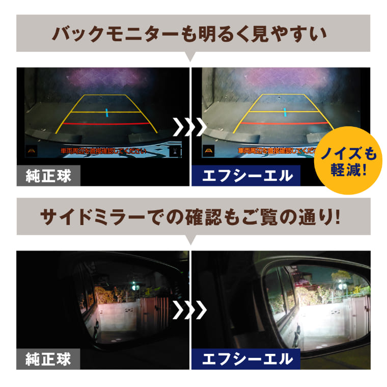 フロントLEDライト(電球色)とセットで購入。 荷室に荷物満載で走ることも少なくなく、どうしてもバックカメラでしか後方確認できない為、明るさに期待して購入しましたが、とても見やすく大満足です。