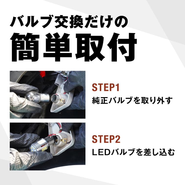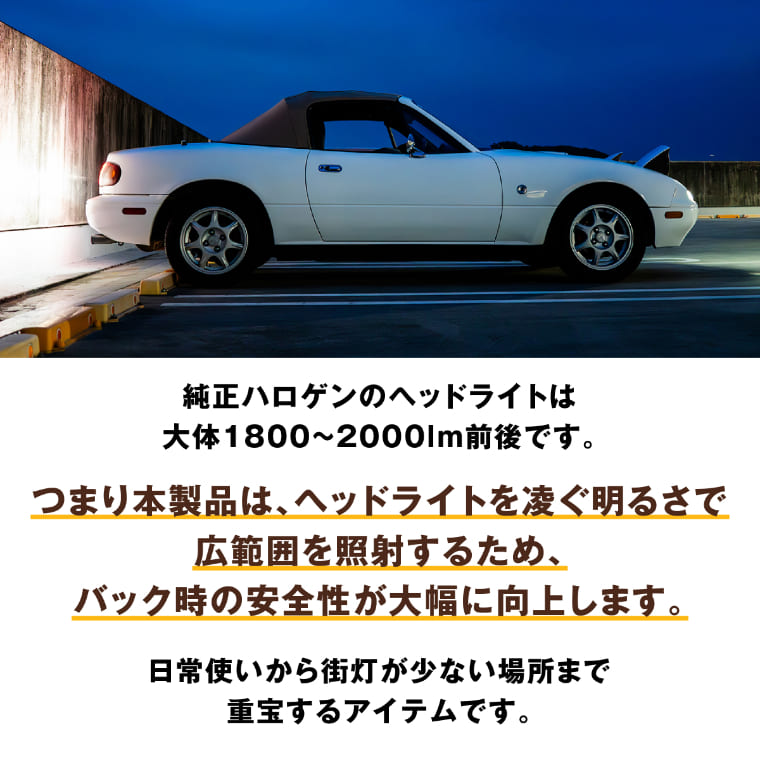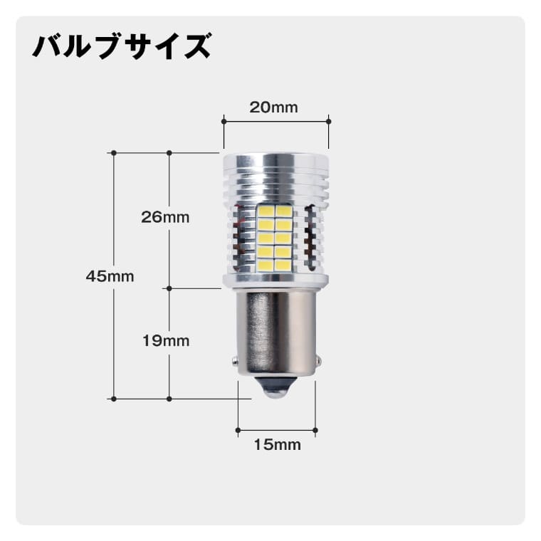 ・ヒートセンサー機能により、一定温度を超えると出力を抑え発熱量を下げるため、LEDが暗くなる場合がございます。 ・バックランプの使用時間は1分程度を目安として設計しているため、極端な長時間点灯はしないでください。商品の早期故障の原因となります。 ・本製品はバックランプ専用商品となります。その他箇所への取付けの際は保証対象外となります。 ・バルブ寸法と現車のスペース確認をお願いいたします。車種により、LEDバルブ本体が車体側へ干渉してしまい、装着不可の場合がございます。 ・取付け時、カチッとロックするまで押込み、脱落しないように装着してください。 |