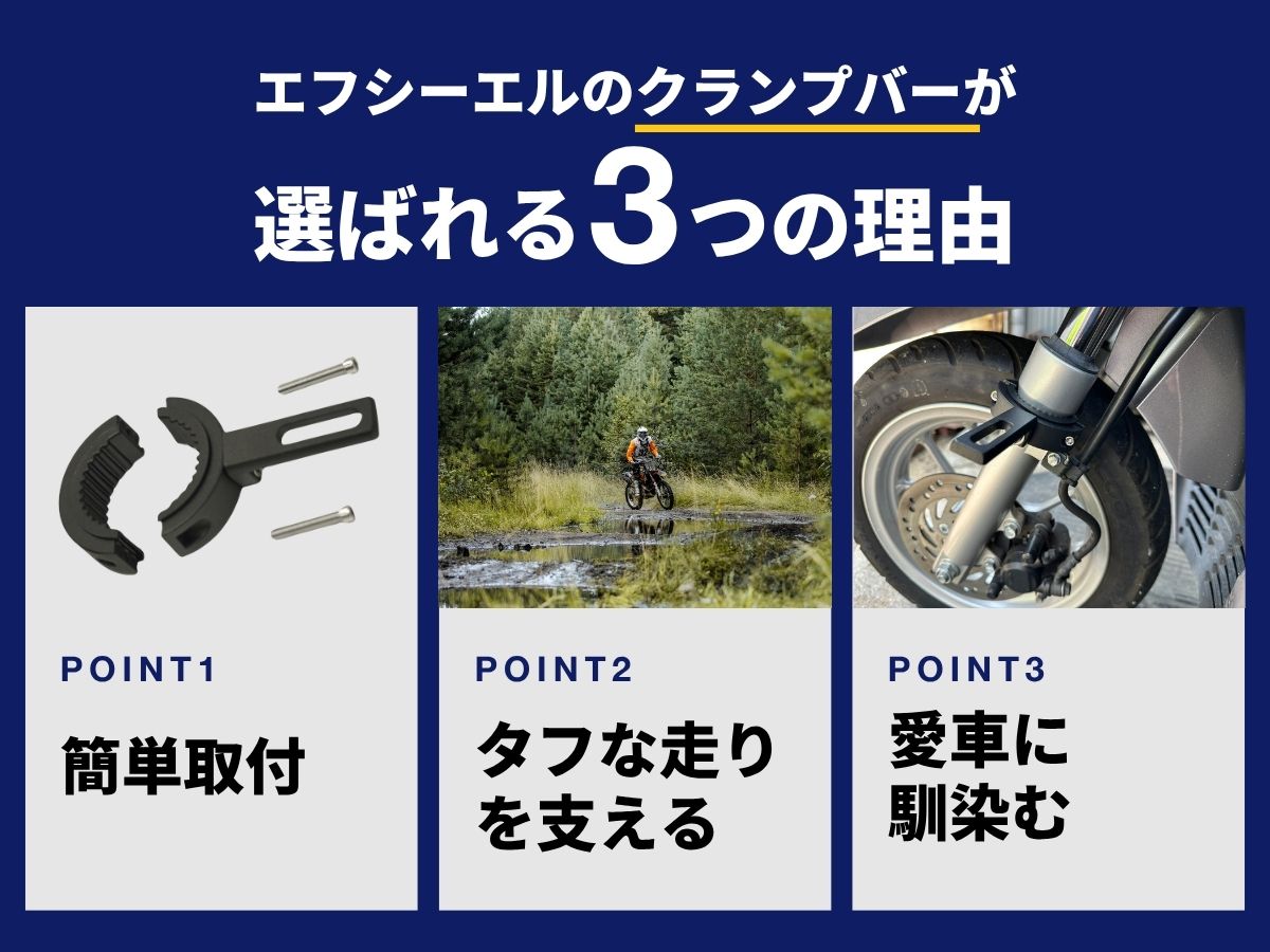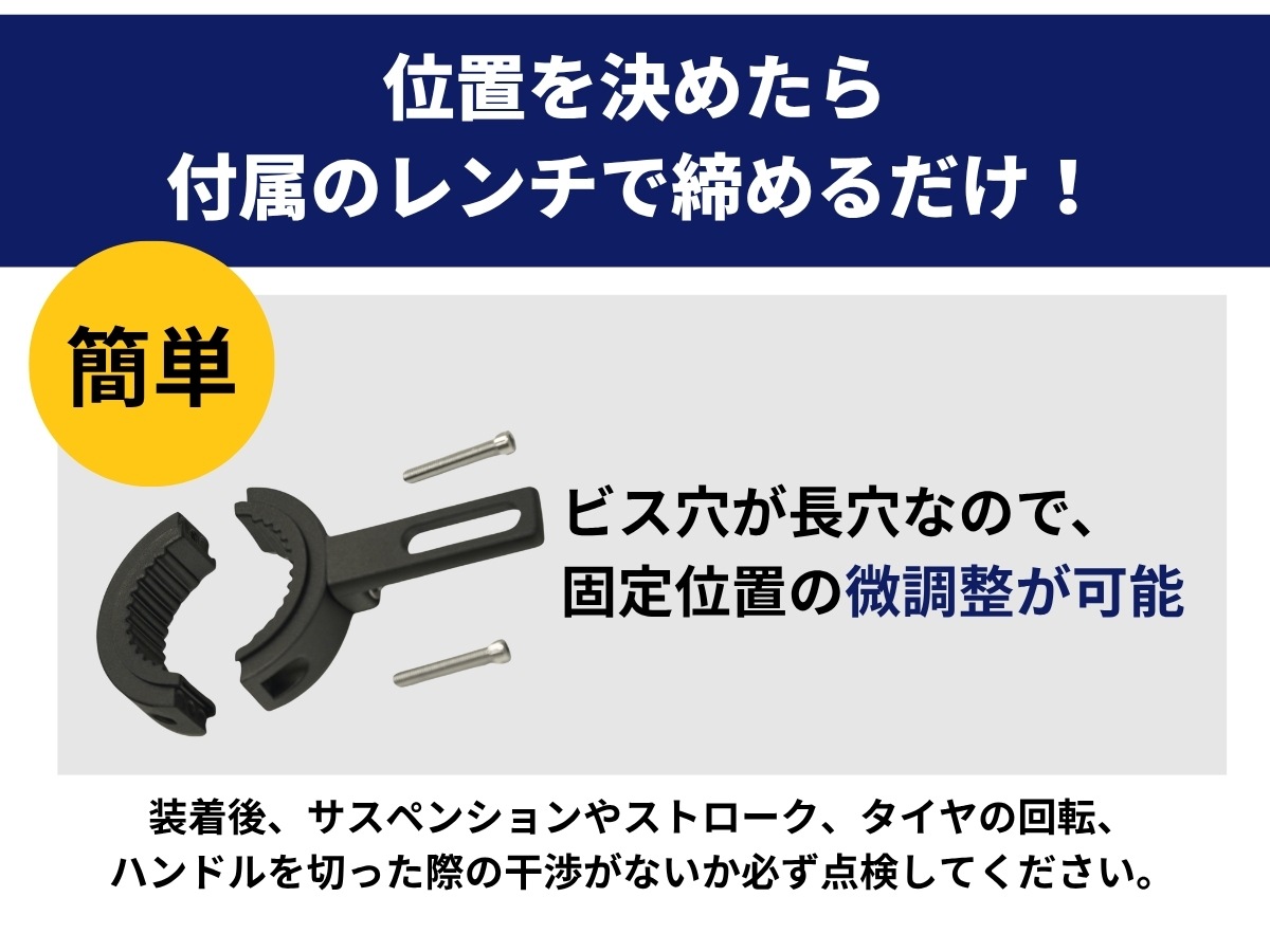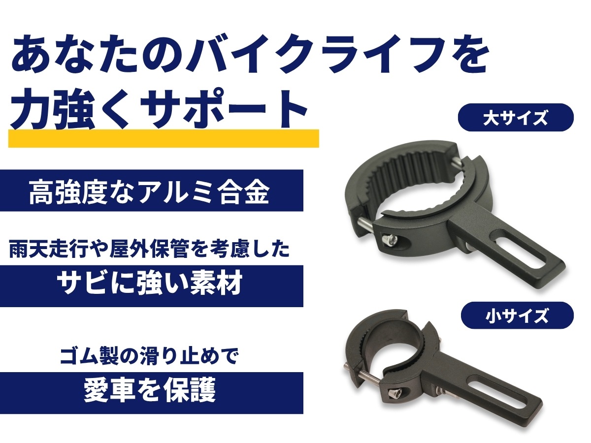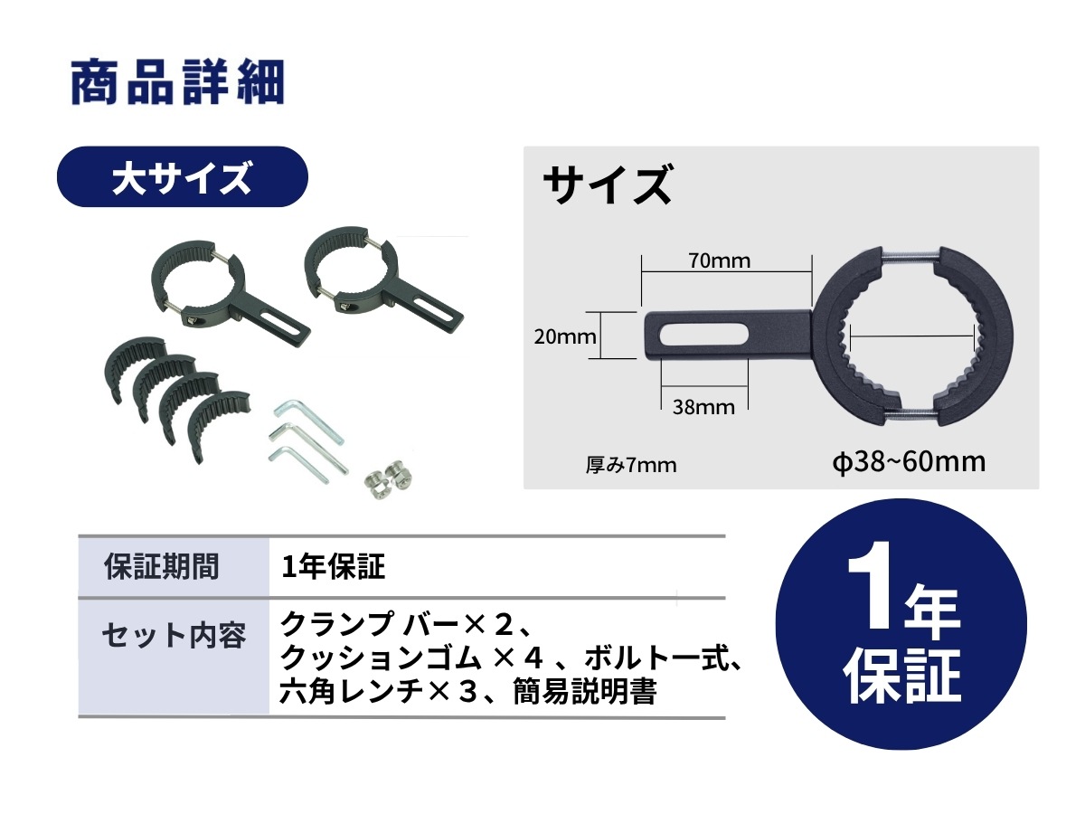 取り付け予定車両の取り付け箇所径に適したサイズを選んでください。 車種によってはサイズが合わずお取り付けいただけない場合がございます。 フロントフォーク部へ取り付けする場合は、左右のボルトを均等に締めてください。チューブが変形する恐れがあるため、締めすぎに注意してください。 弊社フォグランプ程度の重量物を確実に保持できるよう設計しております。製品の破損や車両損傷の恐れがあるため、足をかけたり想定を超える荷重をかけないでください。 取付後は、タイヤを1回転させる、ハンドルを左右に末切りする、加重をかけるなど行い製品や配線が干渉しないよう確認を行ってください。 その他、保証規定、返品・交換、車検については>>ご利用ガイド<<をご確認ください。 |