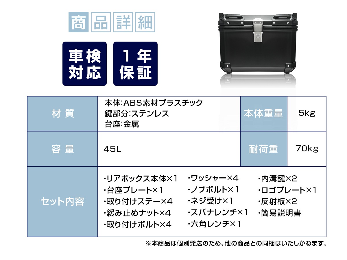 【取り付けについて】 ・本製品には一部の車種、キャリアには互換性がございません。 ・車両側にキャリアがついていない車両へは装着できません。 【安全なご使用のため】 ・本製品を装着すると走行時の安定性が変化します。荷物は重いものを底に置き、左右均等に積載してください。偏った積載はバランスを崩し事故の原因となるため大変危険です。 ・本体とベースを固定するネジなどに緩みがないか定期的に点検してください。緩んだまま使用すると製品が脱落する恐れがあります。 【製品の状態について】 ・輸入品につき、商品に小傷・汚れなどがある場合がございます。 ・購入したばかりの商品は、新品特有のにおいがすることがあります。ふたを開けて風通しのよい場所に数日置いてください。 その他、保証規定、返品・交換、車検についてはご利用ガイドをご確認ください。 |
