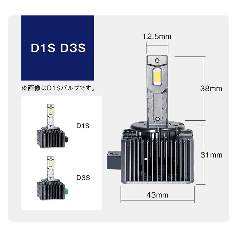 ・バルブ交換後は必ず光軸調整が必要です。 ・HID仕様車の純正バラスト(35W)のみ対応です。45Wや55Wバラストに接続した場合、バラストやLEDバルブへ余分な負荷がかかり、製品を短命化する恐れがあるため、併用できません。 ・D1D3のみ:本製品は、電動ファンを採用しているため、ファン部分をふさぐ設計の車両に取り付けた場合、熱がこもってしまい早期故障の原因となる恐れがあります。 ・装着初期は純正バラストとの相性により、点灯時に細かくチラつきが発生する場合があります。そのまま使用すると、商品破損につながる可能性ありますので、接続を再確認してください。再接続後もチラつきが改善しない場合は使用を中止してください。 |
