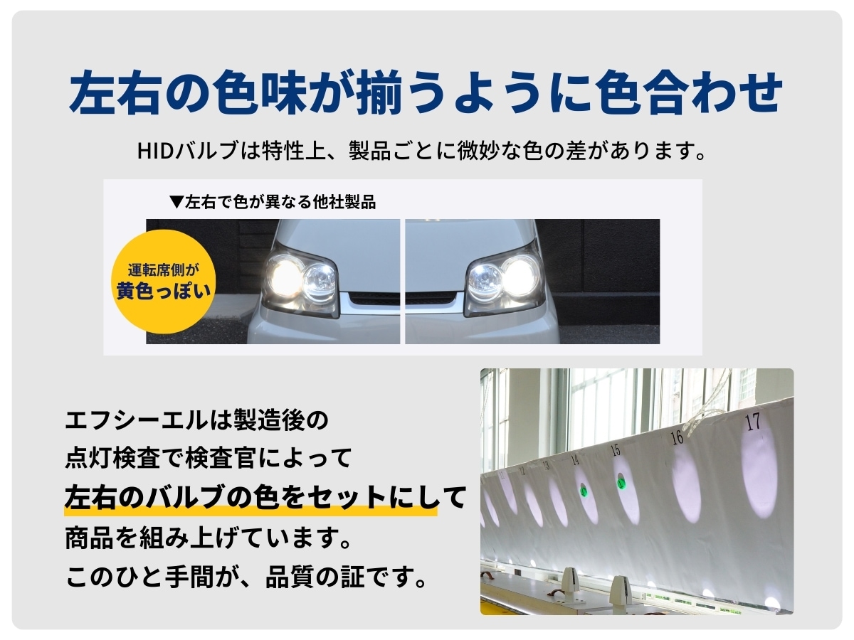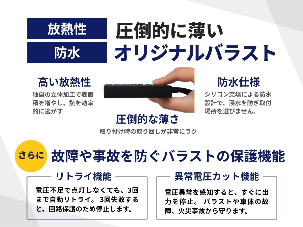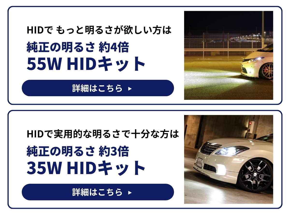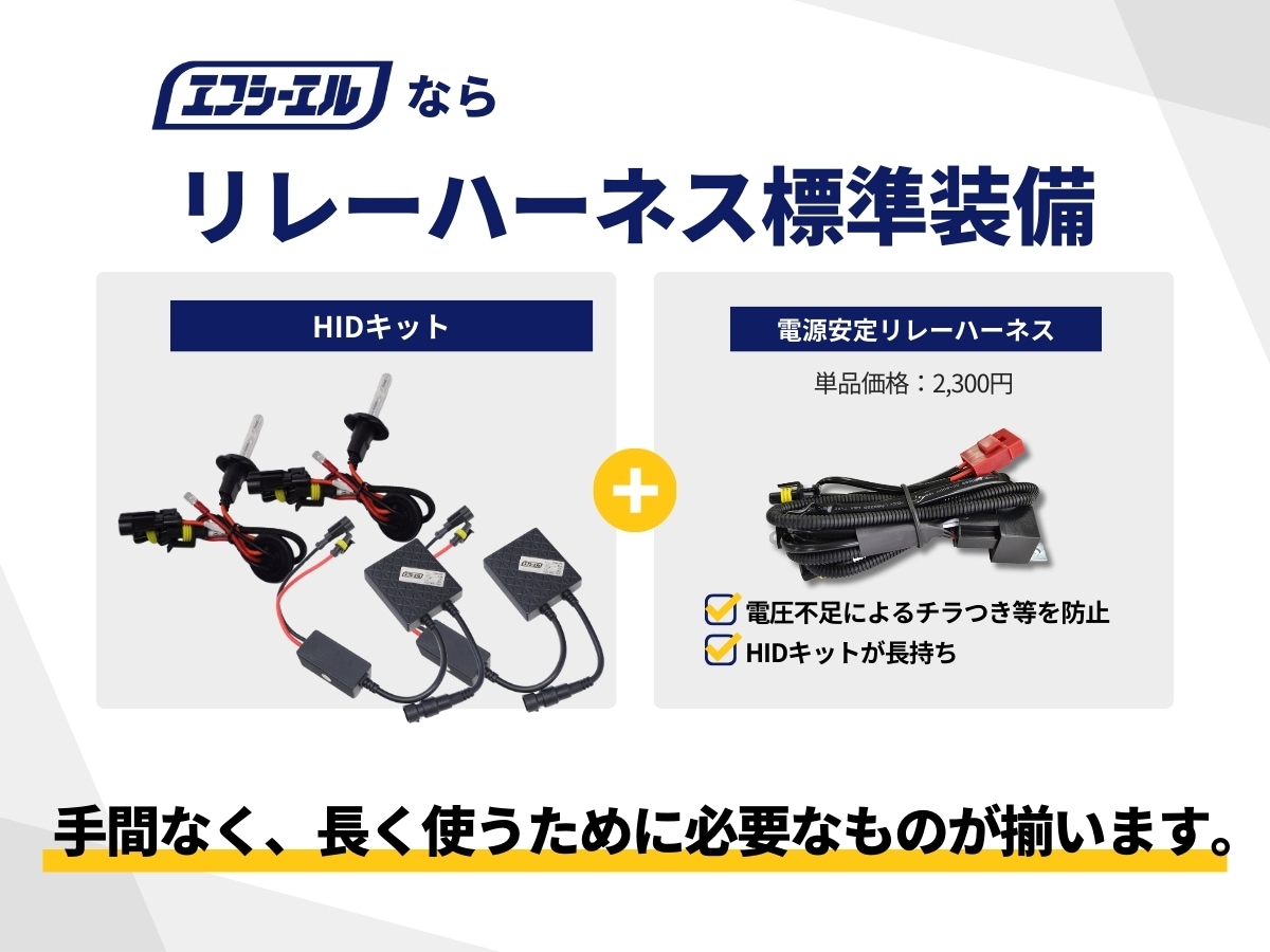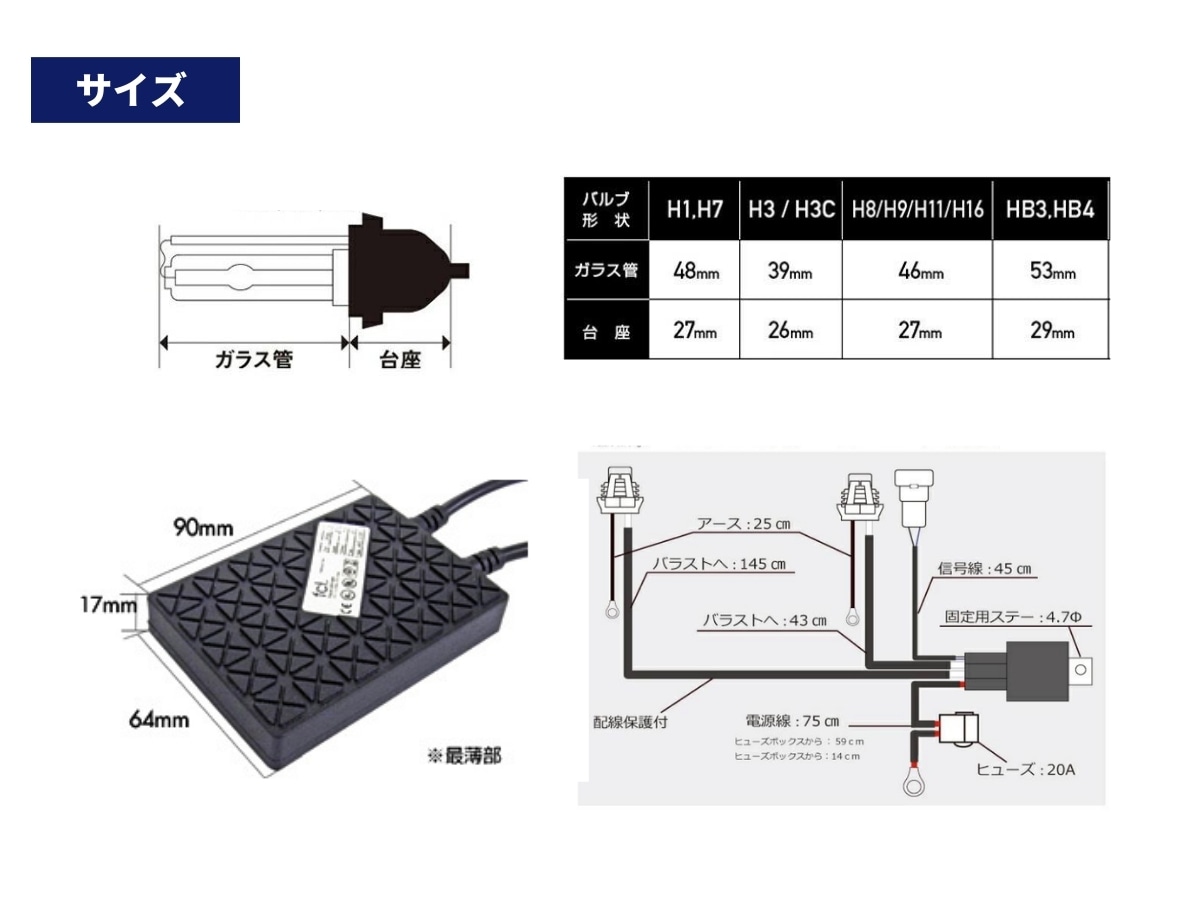 | 最新、その他車種情報は>適合表<をご確認ください。 ご購入前には、必ず現車にて装着されているバルブ形状と取付けスペースの確認をお願いいたします。 ・24V車への装着不可。 ・交換後は必ず光軸調整を行ってください。 ・ライトを交換される際は、光軸が適切な高さになるよう調整を行う必要がございます。 ・一部アイドリングストップでは、エンジン再始動時の電圧変動によりちらつきが発生する場合がございます。これはバラストの保護機能により発生する症状です。 ・HIDバルブ~イグナイタ~バラスト間のハーネスは高電圧が発生するため延長や加工などは絶対に行わないで下さい。 故障や火災等の原因となります。 ・ユニットに樹脂カバーがある場合、配線を通すための穴あけ加工が必要となります。 ・H1タイプの場合、バルブ挿入口が狭いため、挿入口を広げる加工が必要となります。 ・ガラス管を素手で触らないでください。 ・バッテリーの位置によってはリレーの延長加工が必要になる場合がございます。こちらの延長加工につきましては、保証範囲内となります。お車に合わせて延長加工をお願いいたします。 その他、保証規定、返品・交換、車検については>ご利用ガイド<をご確認ください。 |