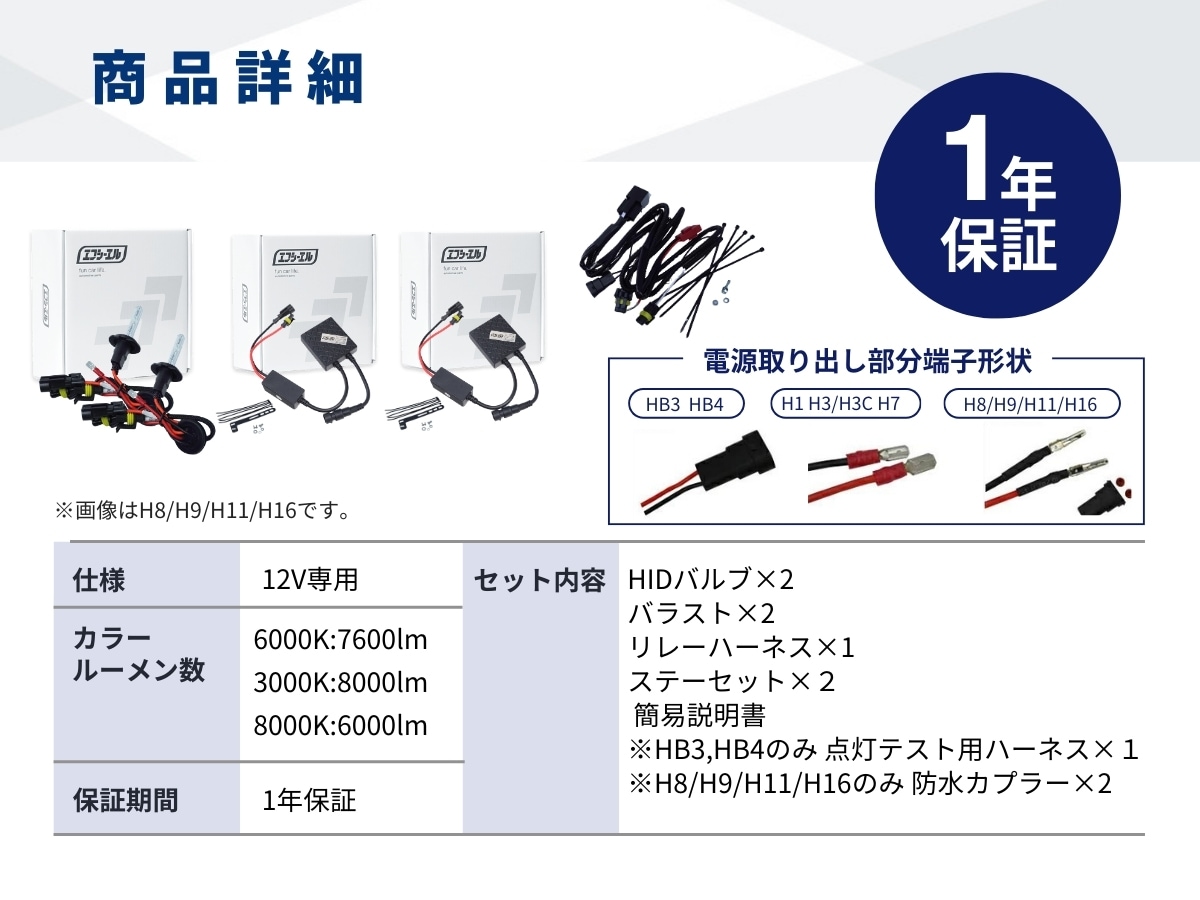 | 【55W】 仕様:12V車専用 カラー/ルーメン数: ・6000K (7600lm) ・3000K (8000lm) ・8000K (6000lm) 保証期間:1年保証 セット内容: ・HIDバルブ ×2 ・バラスト ×2 ・リレーハーネス ×1 ・ステーセット ×2 ・簡易説明書 ※H8/H9/H11/H16のみ 防水カプラー×2 |