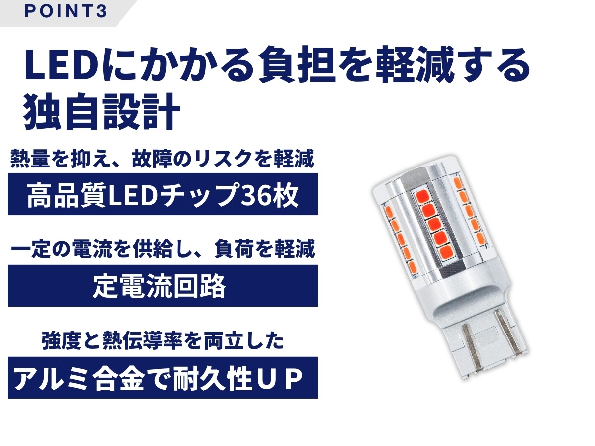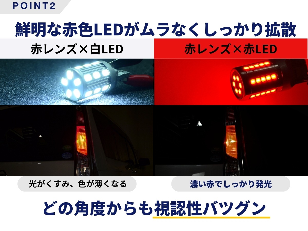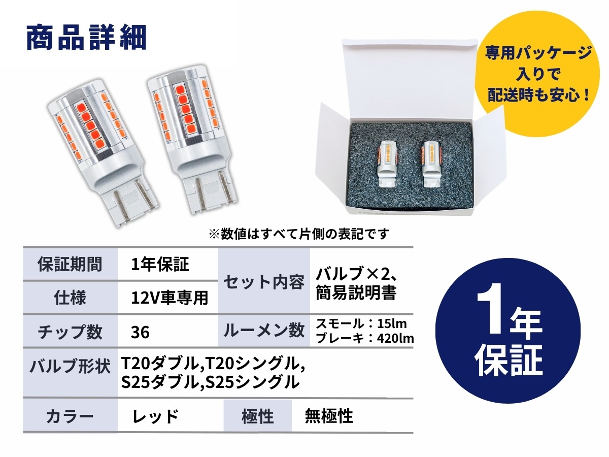 取付箇所:テール&ストップ バルブ形状:T20 ダブル/T20 シングル/S25 ダブル/S25 シングル 保証期間:1年間 チップ数:36 カラー:レッド セット内容:バルブ×2 極性:無極性 |
