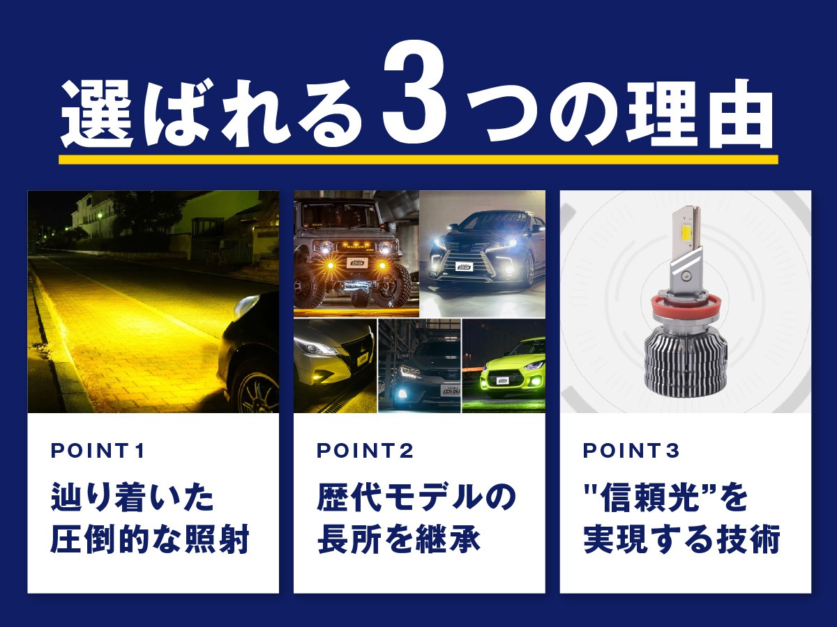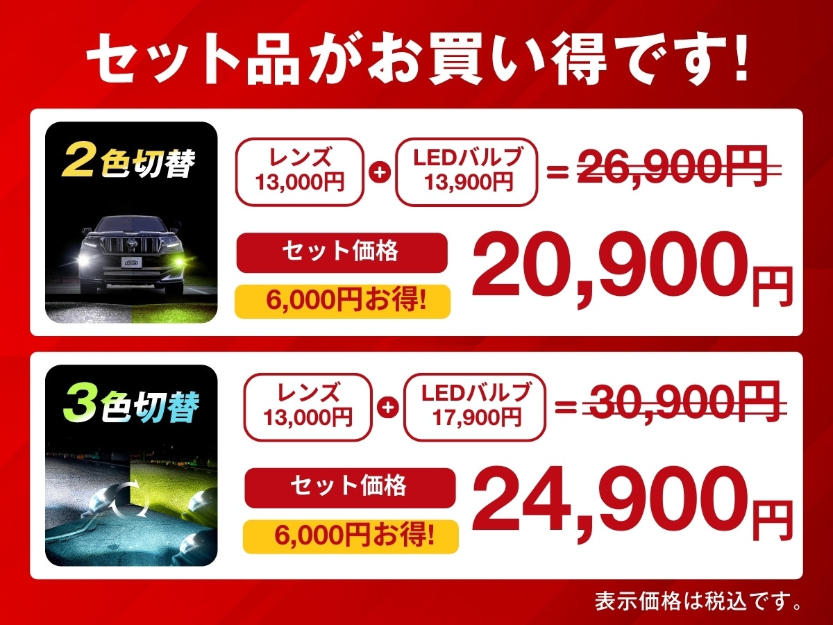 【圧倒的な明るさと配光】 純正LEDフォグでは満足できなかった明るさを劇的に進化させる、LEDバルブとフォグレンズのフルセットです。最大11,000lmという圧倒的な光量と、路面を隅々まで照らすワイドな配光設計により、夜間走行や悪天候時の視認性を大幅に向上させます。アルファード30系やRAV4、ノア90系など人気車種に幅広く対応。くっきりとしたカットラインを実現しているため、対向車への配慮を欠かさず、安全で快適なドライブをサポートします。 【多機能な色切り替え】 不動の人気を誇る2色切り替えに加え、個性を引き立てる3色切り替え(トリチェン)をラインナップしました。純正スイッチをON/OFFするだけで、ホワイトからイエロー、ライム、アンバーなどへ瞬時にカラーチェンジが可能。最新の別体式コントローラーとヒートパイプ構造を採用し、高出力ながら優れた放熱性と長寿命を両立しています。メモリー機能搭載で再始動時も好みの色を維持。ドレスアップと実用性を極めた、こだわり派のためのフォグランプです。 |