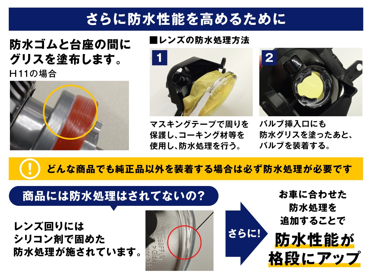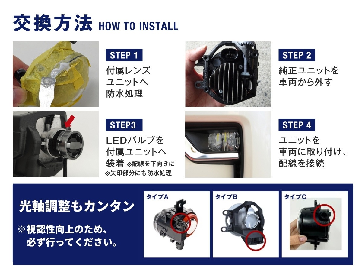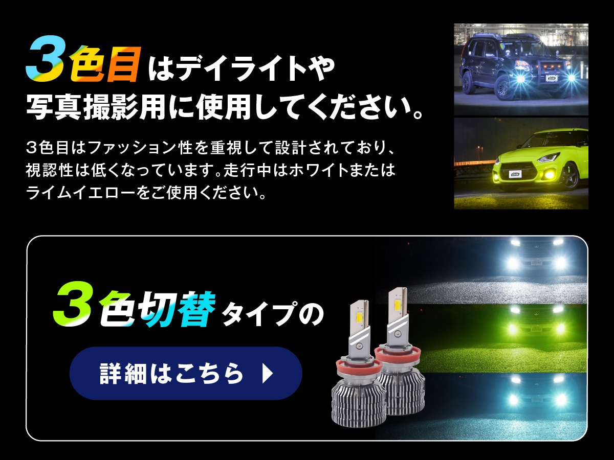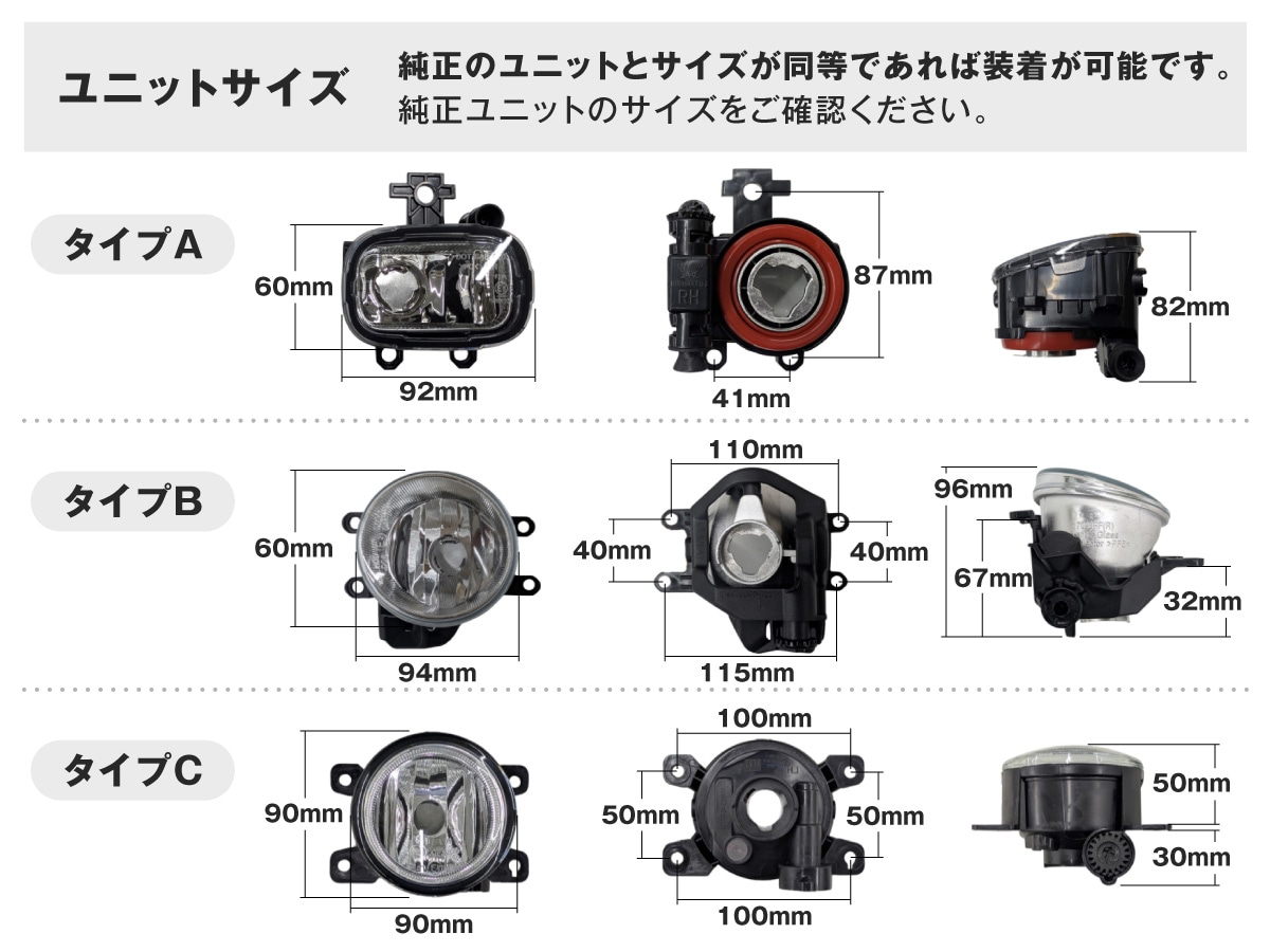 ・装着不可:純正ユニット装着以外の車両、純正バイカラーLEDフォグランプ装着車 ・本製品は純正ユニットと形状が一致している車のみ装着可能です。必ず現車・適合表をご確認ください。特に下記の車種では購入間違いが増えています。今一度ご確認ください。 ・【ノア 90系】S-Z/S-Gグレードはフォグユニット タイプB 、Z・Xグレード(後期のみ)はL1Bバルブ ・【RAV4 50系】アドベンチャーグレードはフォグユニット タイプB 、アドベンチャー以外はL1Bバルブ ・極性があるため、点灯しない場合は逆に差し込んでください。 ・フィンは高温になるため、配線やタイラップが接触・干渉しないよう固定してください。 ・純正ヒューズ10A未満の車両は、10Aへの交換または別売リレーハーネスが必要です。 ・車検時はホワイト、またはイエローを推奨します。車検に通った報告をいただいていますが、色切り替え仕様やカラーに様々な見解があり、検査官の判断によります。検査を受ける車検場・ディーラーにご確認ください。メモリー機能により消灯時の色で再点灯するため、車検時はホワイトかイエローの状態でオフにしてください。 ・点灯色により、カットラインが異なります。「ホワイト」にて調整を行ってください。 ・レンズユニットには、製造工程でやむを得ず、微細なチリ、汚れ、バリ、コーティングムラ、その他僅かな作業時の痕跡(指紋のように見えるものなど)が残る場合がございます。これらは製品の明るさ(点灯性能)や機能に影響を及ぼすものではございませんので、安心してお使いください。これら製造上の特性をご理解いただきますようお願い申し上げます。 ・ご購入前に、必ず現車にて装着されているバルブ形状と取付けスペースをご確認ください。 ・その他、保証規定、返品・交換、車検については>ご利用ガイド<をご確認ください。 |