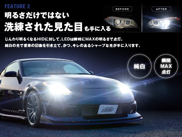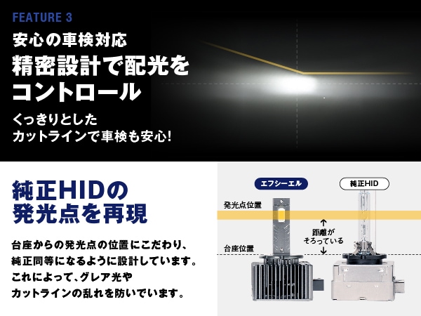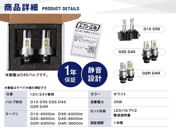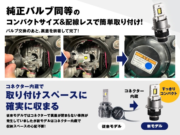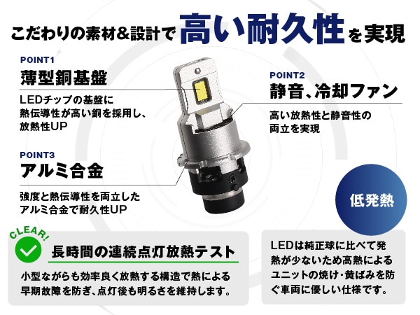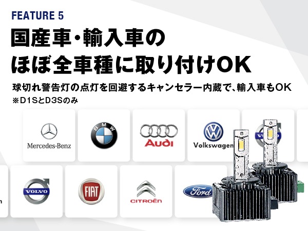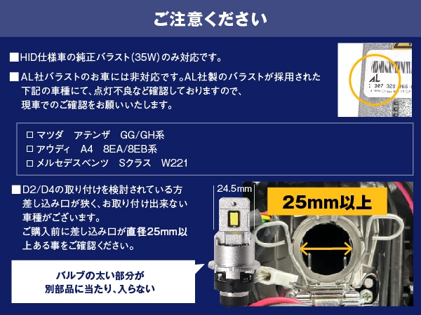 ・バルブ交換後は必ず光軸調整が必要です。 ・HID仕様車の純正バラスト(35W)のみ対応です。45Wや55Wバラストに接続した場合、バラストやLEDバルブへ余分な負荷がかかり、製品を短命化する恐れがあるため、併用できません。 ・D1D3のみ:本製品は、電動ファンを採用しているため、ファン部分をふさぐ設計の車両に取り付けた場合、熱がこもってしまい早期故障の原因となる恐れがあります。 ・装着初期は純正バラストとの相性により、点灯時に細かくチラつきが発生する場合があります。そのまま使用すると、商品破損につながる可能性ありますので、接続を再確認してください。再接続後もチラつきが改善しない場合は使用を中止してください。 ・本製品は、万が一製品不良が発生した際に、バラストへの影響を抑えるために、規定温度を超えると安全回路が作動し消灯する仕様です。何度も発生する場合は、不具合の可能性があるので、サポートまでご連絡ください。 |