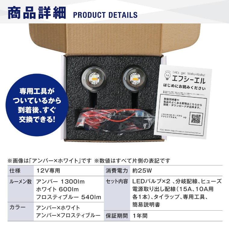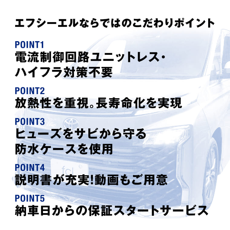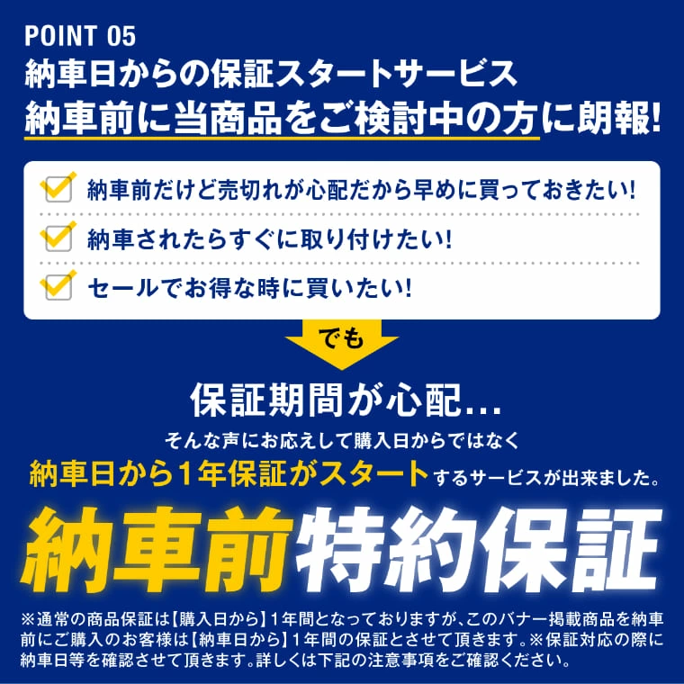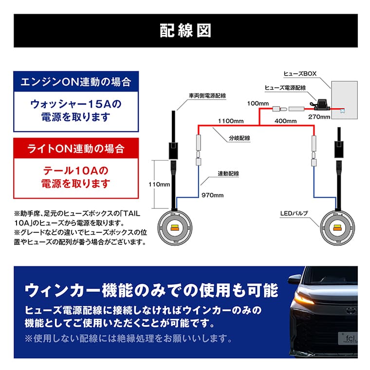 | ■デイライトとして使用した場合、またポジションランプがブルーに点灯している状態では車検非対応になります。 車検の際は本品のウインカーを取り付けた状態で、配線分岐カプラーのギボシ端子を外してから検査を受けて下さい。 このほか車検については地域・車検場によって様々な見解がございます。車検を受けられる場所にてご確認ください。 ■取り付けに際し自動アシスト、ブレーキサポートなどの安全・快適装備機能の誤作動が出る場合があります。 ■シーケンシャルウィンカーと併用する場合、使用状況や環境により正常に作動しないことがございます。 他社製品との互換性は保証致しません。 ■グレード、年式によってはヒューズボックスの配列、電源が異なる場合や装備されていない場合がございます。 ■当商品はイグニッション連動の他、ポジションと連動することも可能です。室内から電源を取り出す場合は配線の延長加工が必要になります。 ■納車前特約保証について 保証期間はご購入時から1年間となっていますが、下記全ての項目に該当する方は【納車日から】1年間の保証とさせて頂きます。 【対象者】 ・新車購入者で該当商品の購入日から納車までの期間が6ヶ月以内の方 ※新古車、中古車の購入は対象外 ※該当商品ご購入日から納車予定日が6ヶ月以上の場合は対象外 ・ご購入時のアンケートでおおよその納車時期を明記頂いた方 ・不具合のご連絡時に車検証の登録日をご提示頂ける方 |