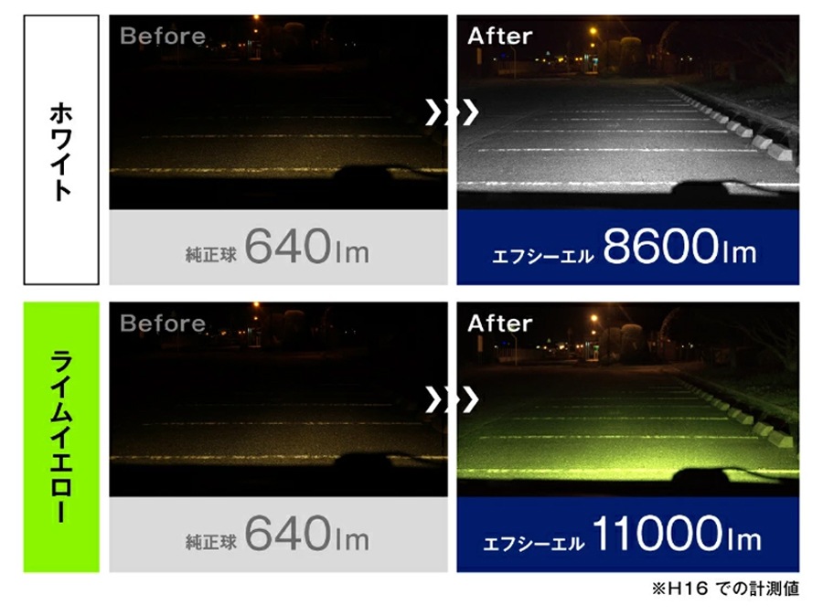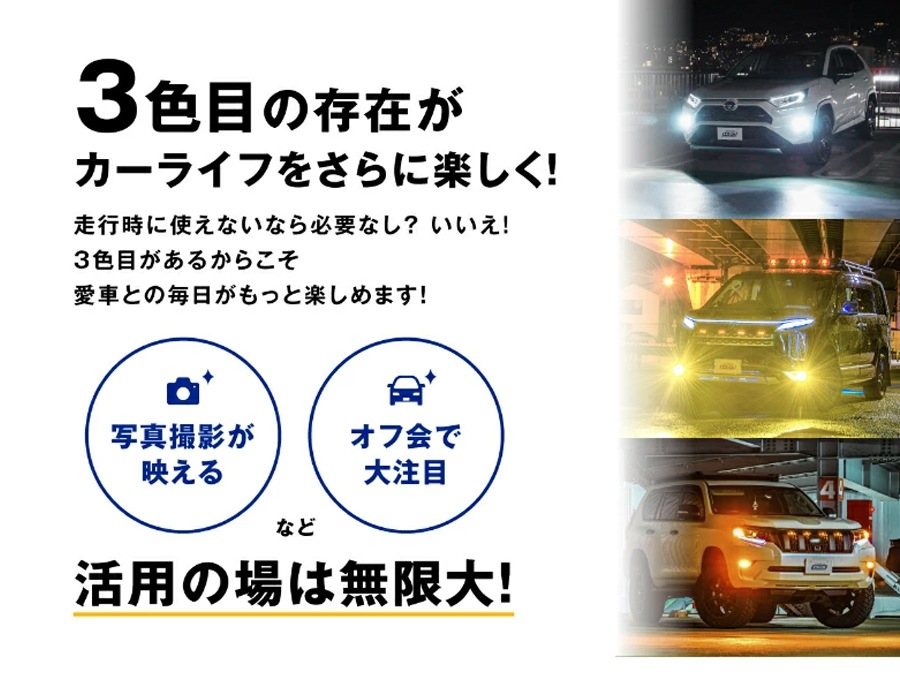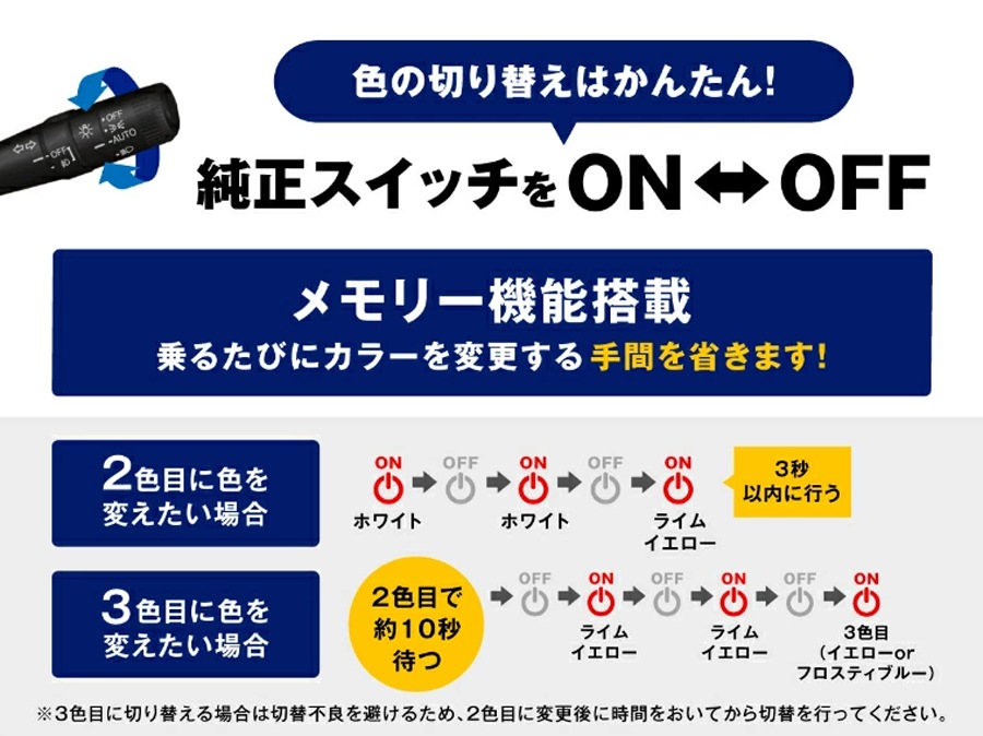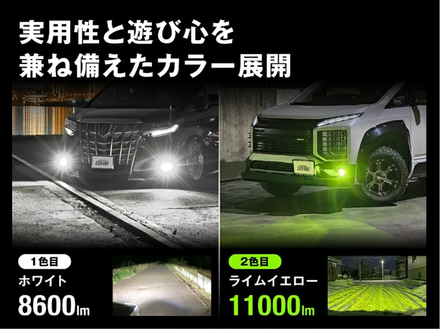 ・ライムイエローは車検基準を満たす黄色ですが、検査官の判断により不適合となる場合がございます。検査時はホワイトに切り替えてください。