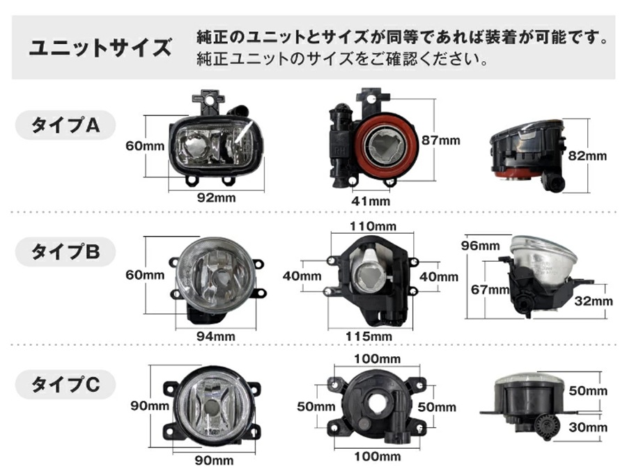 | タイプC ■トヨタ:ピクシスジョイ LA250S,LA260S H27.9~R5.8 クロスオーバー ファッション・スポーツ / ピクシスメガ LA700S・LA710S H28.5~ ■三菱:アウトランダー PHEV GG2W H27.7~R3.11 / デリカD:5 CV#W H31.2~ シャモニー含む / デリカD:2 MB37S R2.12~ カスタム含む ■ホンダ:グレイス GM4/5 H26.12~ ハイブリッド / グレイス GM6/9 H29.7~ / ステップワゴン RP系 H27.4~H29.8 Moduro X / フィット GK5・6,GP5・6 H29.6~R2.1 / フリード GB5/6/7/8 R1.10~R6.5 / フリード+ GB5/6/7/8 R1.10~R6.5 ■スズキ:イグニス FF21S H28.1~ / エスクード 5AA-YEH1S R4.4~ / クロスビー CBZK・CBZL H29.12~R7.9 / スイフトスポーツ ZC32S H23.12~H28.12 / スイフトスポーツ ZC33S H29.10~ / スペーシア カスタム MK53S H29.12~R5.11 / スペーシア ギア MK53S H30.12~R5.11 / スペーシアベース MK33V R4.8~ / ソリオ MA37S R2.12~R5.11 バンディット含む ※リフレクタータイプのみ取付け可 / ハスラー MR52S/92S R6.5~ HYBRID X/HYBRID Xターボ/タフワイルド HYBRID G/HYBRID Gターボ / ワゴンR スティングレー MH55S/MH35S H29.2~R4.7 フォグランプ LED仕様 / ワゴンR スティングレー MH55S R4.8~ / ワゴンRスマイル MX81S/MX91S R3.9~R6.12 ■ダイハツ:キャスト LA250S/LA260S H27.9~R5.8 スポーツ・アクティバ スタイル / ウェイク LA700S/LA710S H28.5~ ■マツダ:フレア MJ95S/MJ55S H29.3~ / フレア クロスオーバー MS92/52S R2.2~ / フレア ワゴン MM53S H30.12~ タフスタイル ■スバル:WRX S4 DBA-VAG H29.7~R3.11 / WRX STI CBA-VAB H29.6~R2.12 / XV GT系 R1.11~R4.12 / インプレッサ GU系 R5.3~ / インプレッサ G4 GK系 R1.11~ / インプレッサ スポーツ GT系 R1.11~ マイナー後 / クロストレック GU系 R5.1~ ツーリング リミテッド / クロストレック 5AA-GUF R6.12~ ハイブリッド / フォレスター SK系 R3.8~R7.3 角型フォグの場合は取付不可 / レヴォーグ VM系(D型) H29.8~R2.9 |