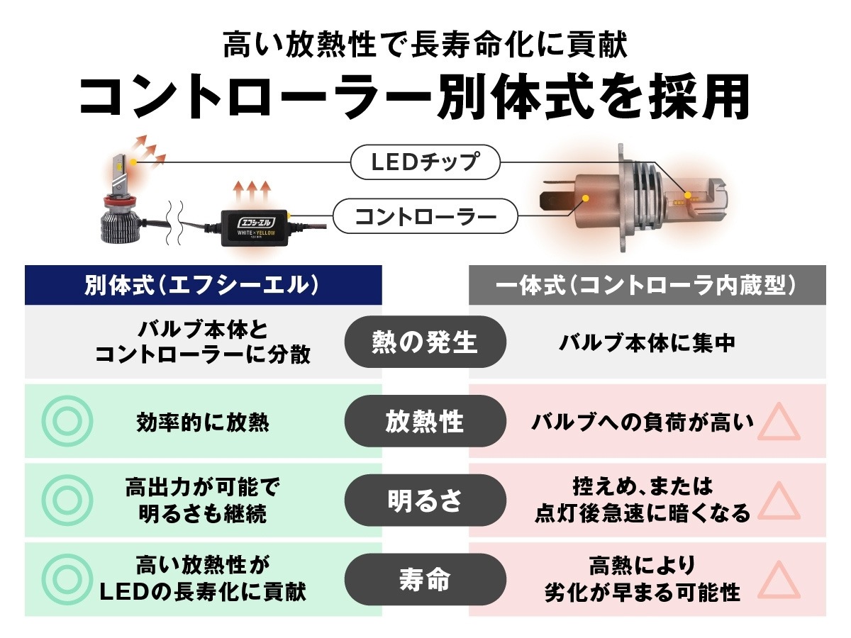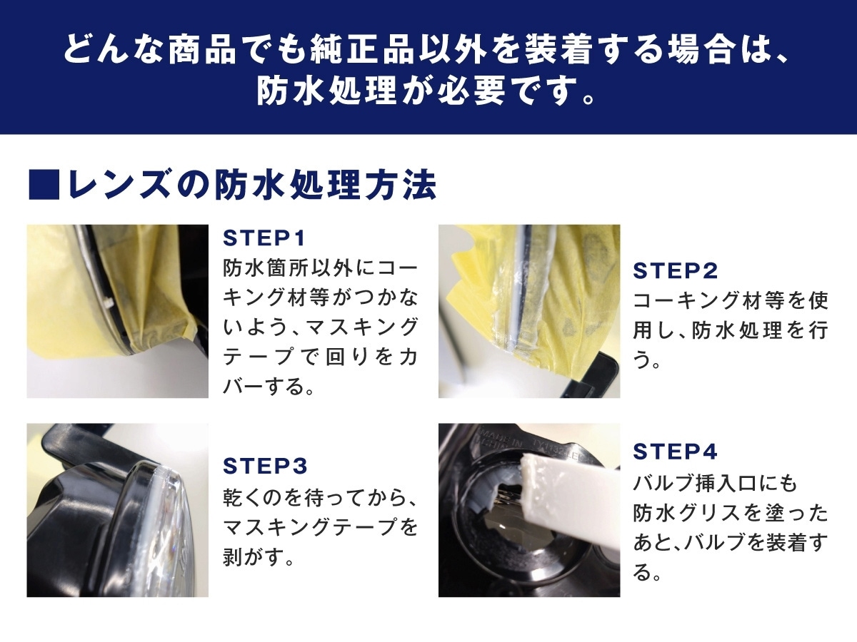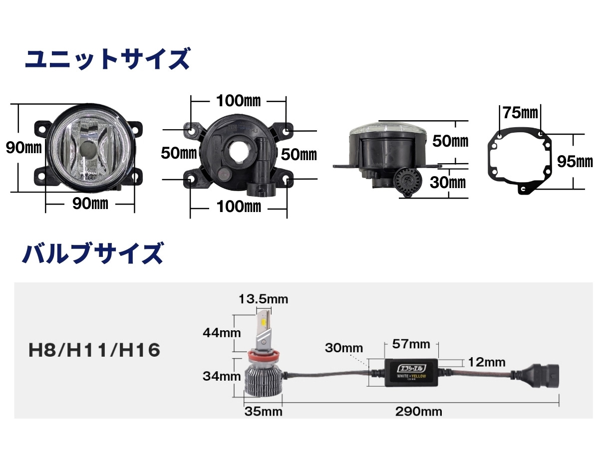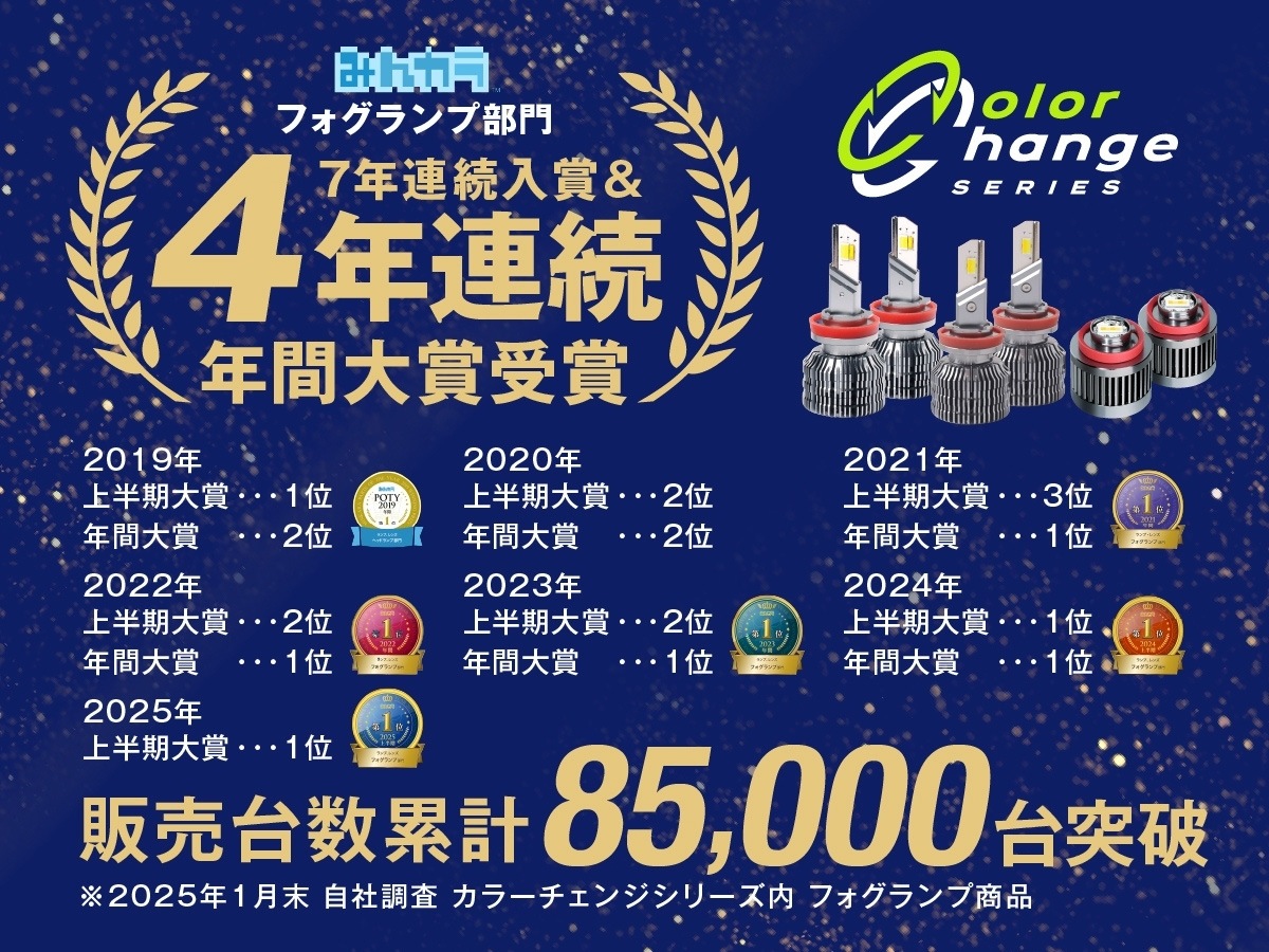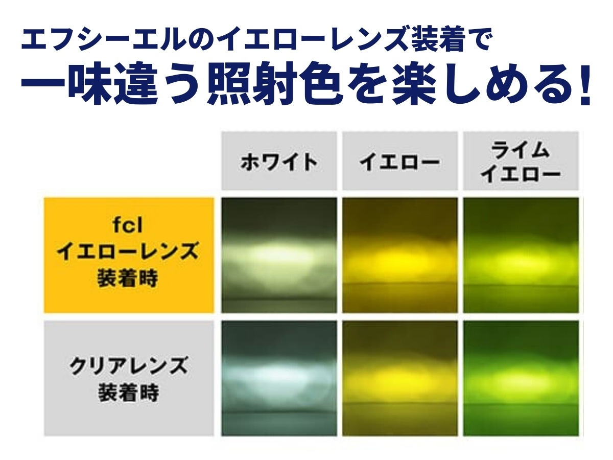 ・フォグランプ未装着車へは装着できません。 ・極性があるため、点灯しない場合は逆に差し込んでください。 ・フィンは高温になるため、配線やタイラップが接触・干渉しないよう固定してください。 ・純正ヒューズ10A未満の車両は、10Aへの交換または別売リレーハーネスが必要です。 ・車検時はホワイト、またはイエローを推奨します。色切り替え仕様やカラーに様々な見解があり、検査官の判断によります。検査を受ける車検場・ディーラーにご確認ください。メモリー機能により消灯時の色で再点灯するため、車検時はホワイトかイエローの状態でオフにしてください。 ・点灯色により、カットラインが異なります。「ホワイト」にて調整を行ってください。フォグベゼルの影響により、照射光が少し乱反射して見える場合があります。 ・レンズユニットには、製造工程でやむを得ず、微細なチリ、汚れ、バリ、コーティングムラ、その他僅かな作業時の痕跡が残る場合がございます。これらは製品の明るさや機能に影響を及ぼすものではございませんので、安心してお使いください。 ・ご購入前に、必ず現車にて装着されているバルブ形状と取付けスペースをご確認ください。 ・その他、保証規定、返品・交換、車検については>ご利用ガイド<をご確認ください。 |